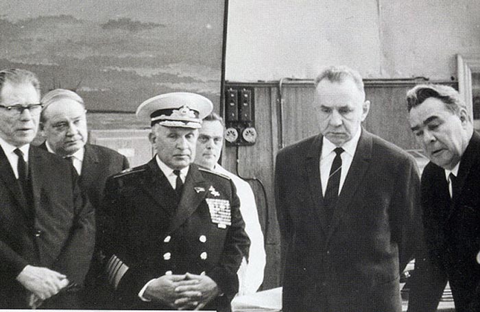 Л.И.Брежнев, А.Н.Косыгин, Главком ВМФ С.Г.Горшков, зампред Совмина СССР Л.В.Смирнов и секретарь ЦК КПСС Д.Ф.Устинов на СЕВМАШЕ (1967 год).