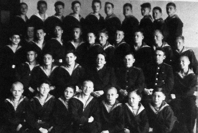2 ряд: Коля Стрельник, Валя Балышев, Витя Кузнецов, Ксения Вячеславовна Толстая, преподаватель русского языка и литературы, Н.А.Климович, мичман Тетерев, Саша Базько.