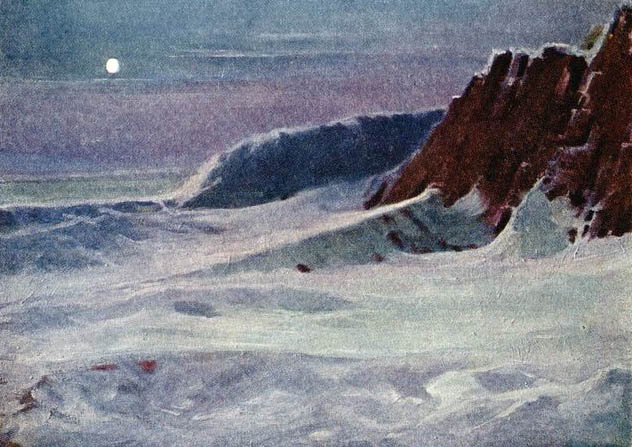 Вдруг на горизонте показалась какая-то точка. Она то появлялась, то исчезала, но видно было, что точка движется вдоль берега. Вскоре можно было различить мачты. Шло судно, похожее на шхуну. Оно то поднималось на высокие гребни воды, то скрывалось в провалах между водяными горами. От сильной качки шхуна ложилась на борт так, что мачты ее почти касались воды. Вскоре нам стало отчетливо видно, как волны одна за другой перекатываются через ее палубу.