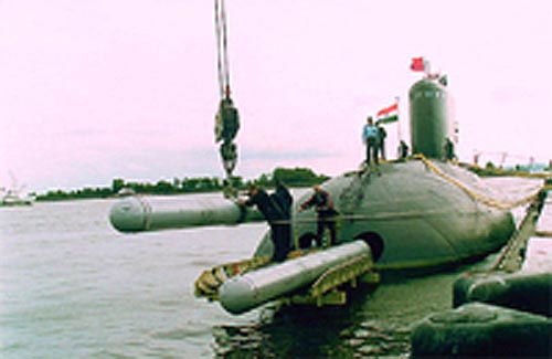 Загрузка ракет системы "Клаб" на подводную лодку.