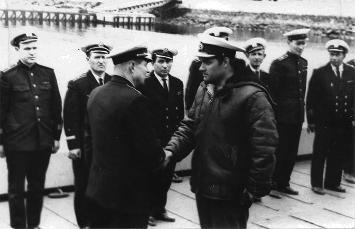 Командир 12-й ЭскПЛ СФ контр-адмирал В.Г.Кичев поздравляет командира ПЛАРБ "К-19" капитана 2 ранга Э.А.Ковалева с отличным выполнением ракетной стрельбы экипажем подводной лодки летом 1967 года (бухта Ягельная, Сайда-Губа).