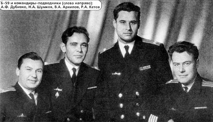 Командиры ПЛ (слева направо): А.Ф.Дубивко («Б-36»), H.A.Шумков, («Б-130»), НШ бригады В.А.Архипов, Р.А.Кетов («Б-4»). Предоставлено Р.Кетовым. Кубинский кризис. Хроника подводной войны. Питер А. Хухтхаузен. «Собеседник», 17 марта 2004 г.